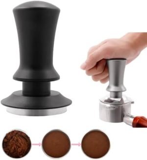 - Unique Design The coffee tamper is made of a 304 stainless steel base with anodized aluminum handle. Our coffee tamper is spring loaded and requires no additional adjustments. It has an ergonomic handle with a comfortable grip that allows you to easily push ground coffee.